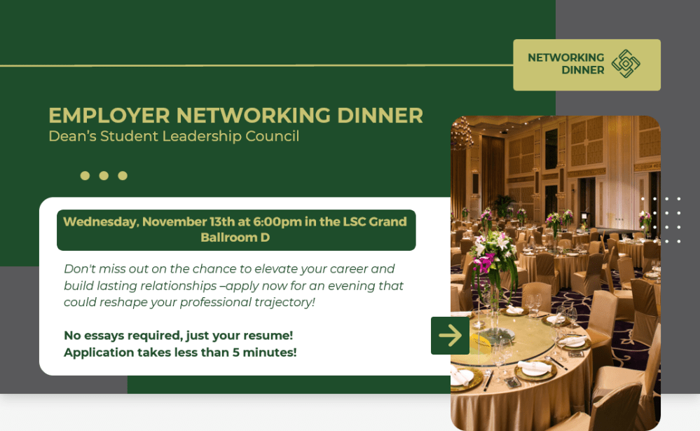 Has it ever felt difficult to truly leave a lasting impression on a job recruiter at a crowded career fair or swiftly passing through their tabling event in Rockwell West Foyer? The Dean’s Student Leadership Council of the College of Business in conjunction with the Career Management Center is hosting an Employer Networking Dinner on November 13th, 2024, from 6:00-7:30 PM! This exclusive event seeks to bring together students who are potential new hires and interns with industry leaders amongst all sectors of business, to network with employers and job recruiters over a FREE three course meal!